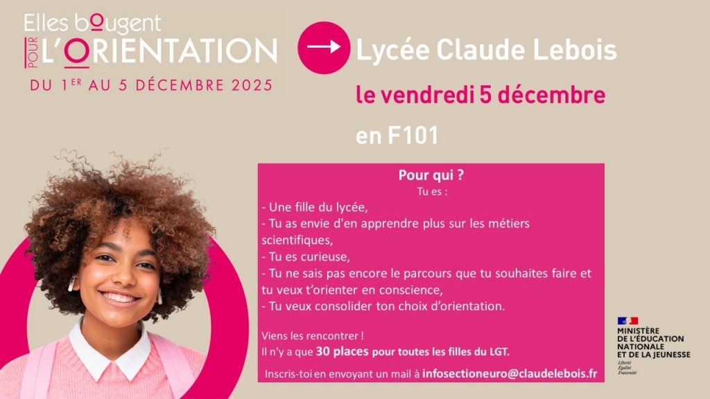 ELLES BOUGENT POUR L’ORIENTATION (05/12/2025) Publié le 25 novembre 202525 novembre 2025 par webmestre (intervention réservée aux élèves de l’établissement)