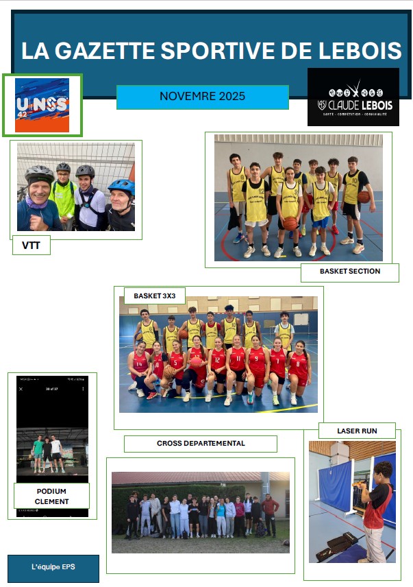 LA GAZETTE SPORTIVE DU MOIS DE NOVEMBRE Publié le 1 décembre 20251 décembre 2025 par webmestre Le numéro 13 de la Gazette est disponible en suivant ce lien : https://claude-lebois.ent.auvergnerhonealpes.fr/vie-de-la-cite/associations-et-clubs/association-sportive-claude-lebois-unss-/….