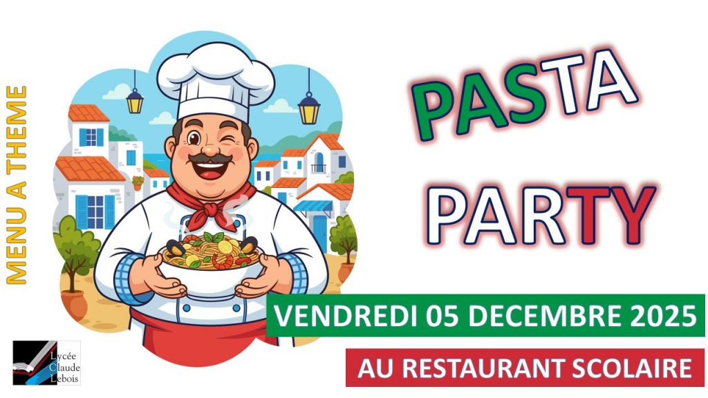 MENU A THÈME : PASTA PARTY (05/12/2025) Publié le 1 décembre 20251 décembre 2025 par claudelebois M. Bourrat et son équipe vous invitent à une Pasta Party le vendredi 05 décembre 2025. Quelle sauce allez-vous choisir pour accompagner vos spaghettis : bolognaise végé ou bleu ? (En complément : une entrée, un fromage et un dessert).