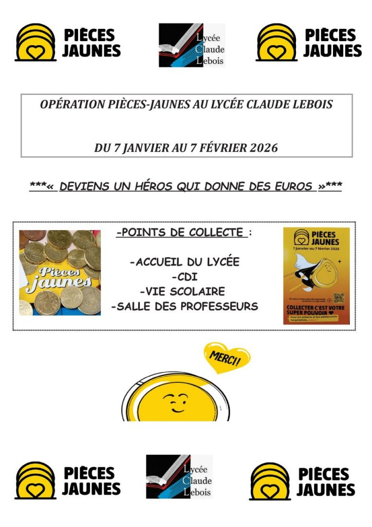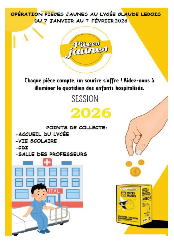 L’ « Opération Pièces Jaunes » qui se déroule du 07 janvier au 7 février 2026 au lycée a pour objectif de collecter les pièces de monnaie à destination de la fondation des Hôpitaux qui œuvre à améliorer les conditions d’hospitalisation des enfants et des adolescents.