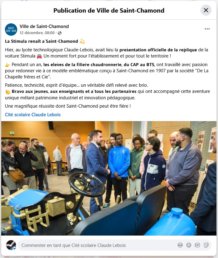 Publication Facebook Mairie de Saint-Chamond : « La Stimula renaît à Saint-Chamond (12/12/2025) Publié le 12 décembre 202517 décembre 2025 par webmestre